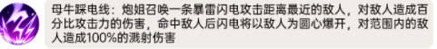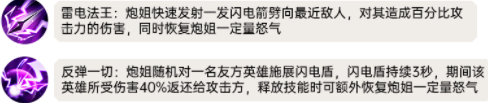 实际效果:炮姐任意对一名己方英雄使出闪电盾,闪电盾不断3秒,期内该英雄所受伤40%退还给进攻方,释放出来技能时需附加修复炮姐一定量怒火。