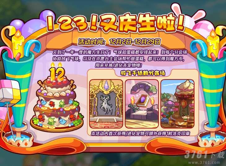 又到了一年一度的魔方生日了!气球和蛋糕都安排起来!到每个分会场协助放飞气球,以及在许愿台主会场帮忙做蛋糕,都可以得到魔方币!用魔方币可以兑换各宠物哦!