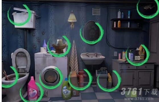 1、浴室找茬-找出十处不和谐的地方分别是:洁厕灵、筷子、手、清朝格格、危险物品、火锅、南瓜、消防栓、摄像头、陈酷